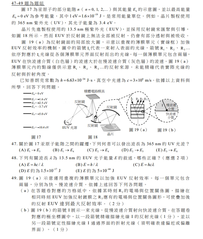 觀察今年考題,專家普遍認為兼具實用性與學術性。比方說,台灣的半導體科技超強,晶片先進製程跟市占率都是全球第一,自然科第47題至49題便呼應此事,探討晶片先進製程,涉及到原子能階、愛因斯坦的光子說、相長性干涉、波的入射、反射與折射波強度之間的關係。