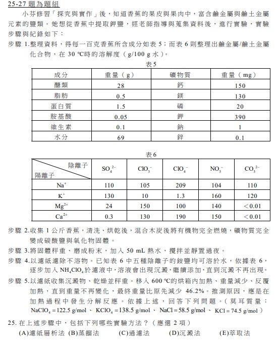 其中,較特別的題目有第25題到第27題,探討香蕉中的礦物質組成與分析方法,將化學知識應用在生活中。
