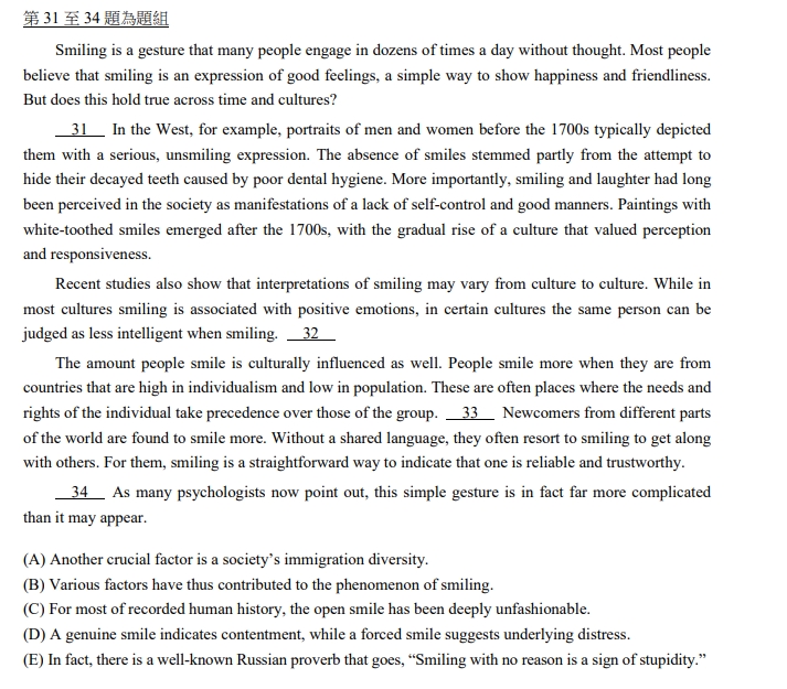 例如篇章結構題型31至34題組,為微笑(smiling)在不同文化中的功能與解讀。評量重點為:第31題,是否掌握文章段落主題句;32至33題(訊息轉折),是否掌握段落間的文意連貫;34題(總結全文論述),是否掌握全文組織架構。