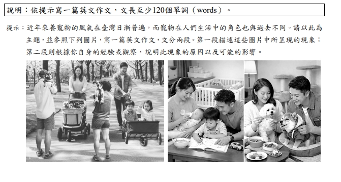 作文部分今年仍是圖片引導寫作,以寵物為主題。解題教師團隊分析,雖然貼近考生的生活經驗,但能否寫出符合主題的的描述及其原因、影響,除了評量學生的字詞拼寫、句子以及段落書寫的寫作能力,更考驗其邏輯思考、判斷與創造力的學習表現。