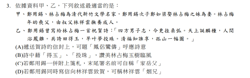 台北市高中國文科教師群指出,14-15題以表格整理量詞的方式,結合重要選文中的量詞。28題則圖文並茂,由元雜劇到新月派徐志摩,整合各代韻文的表現方式與詞句加工,「之前未見」;而第3題鄭用錫與林占梅的祝賀詩,則屬應用文的變型。