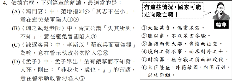 其中,「題型創新」尤其值得關注。第4題以韓非六項發言列表,對讀《鴻門宴》、《燭之武退秦師》、《諫逐客書》、《孟子》重要選文,做正確判斷。14題考量詞,以左右雙框表格,檢視五項課內選文的量詞用法,這些均為以往未見題型。