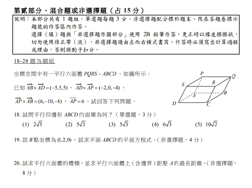 中山女高數學老師林奕廷分析,今年數A第1題就是時事題,提到抽發財金活動,第4題則是生活情境題,以網路遊戲的情境融入,結合排列組合知識。混合題型配分約為15分,除了單選題外,亦包括非選擇題,例如第20題提到平行六面體的體積,運用外積的性質。