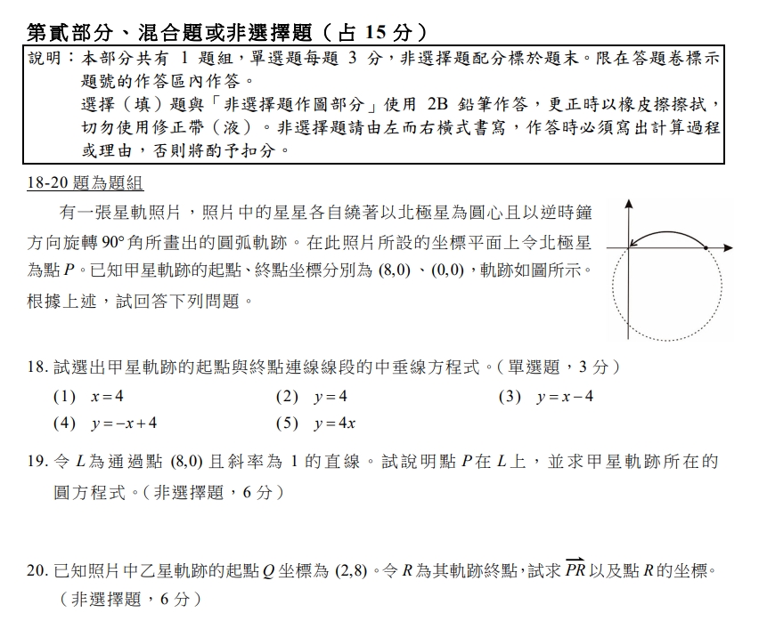 考題很吃理解活用,師大附中數學老師楊翔宇說,如第6題提到各國的領海基線,考生要能理解其定義,並轉化為平行線距離;第4題、第18題至第20題提到經緯線概念、星星轉動的軌跡,考生要懂經緯線的基本概念,並將之轉化為圖像,以對應直線、圓與球等數學概念。