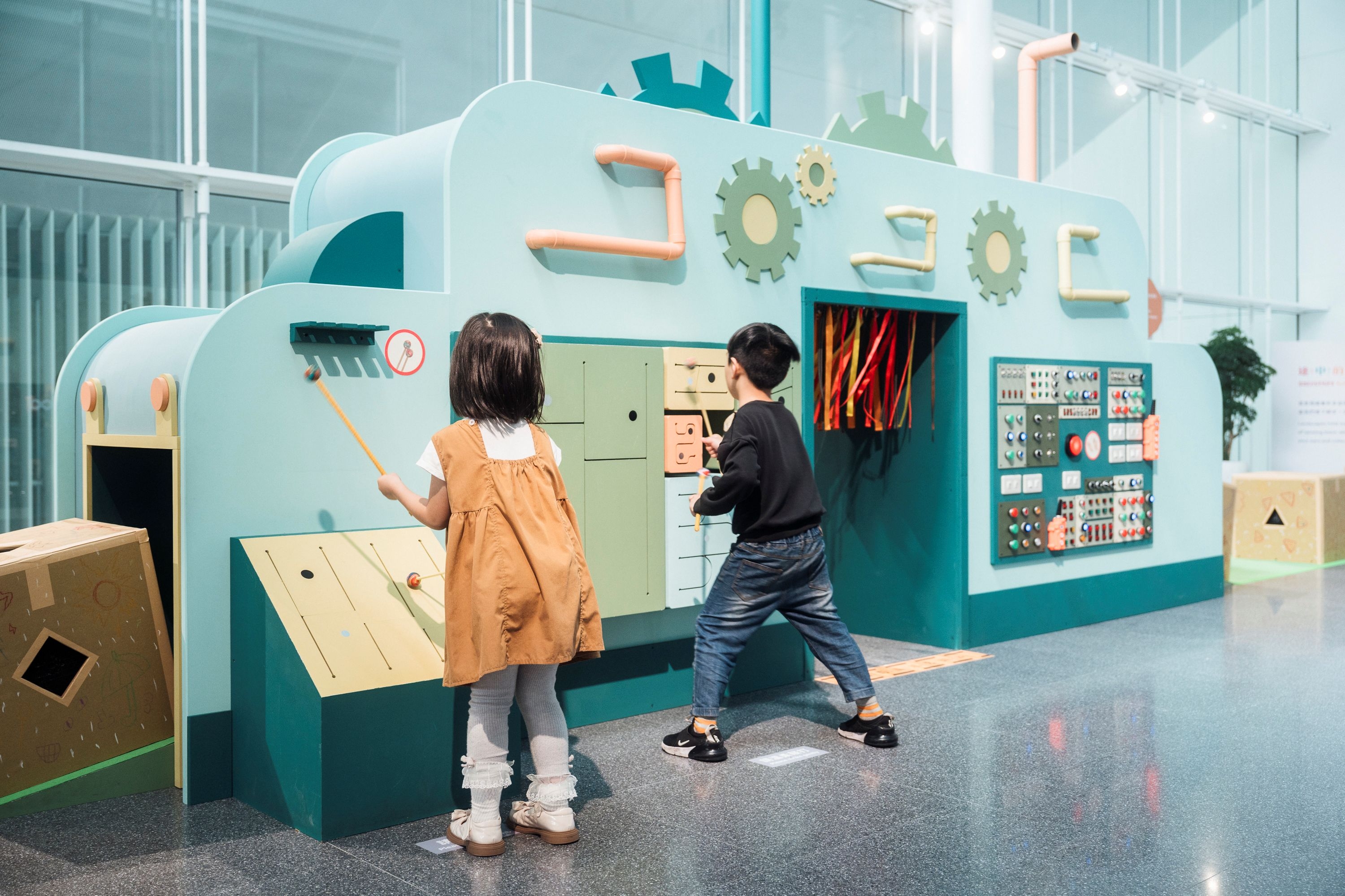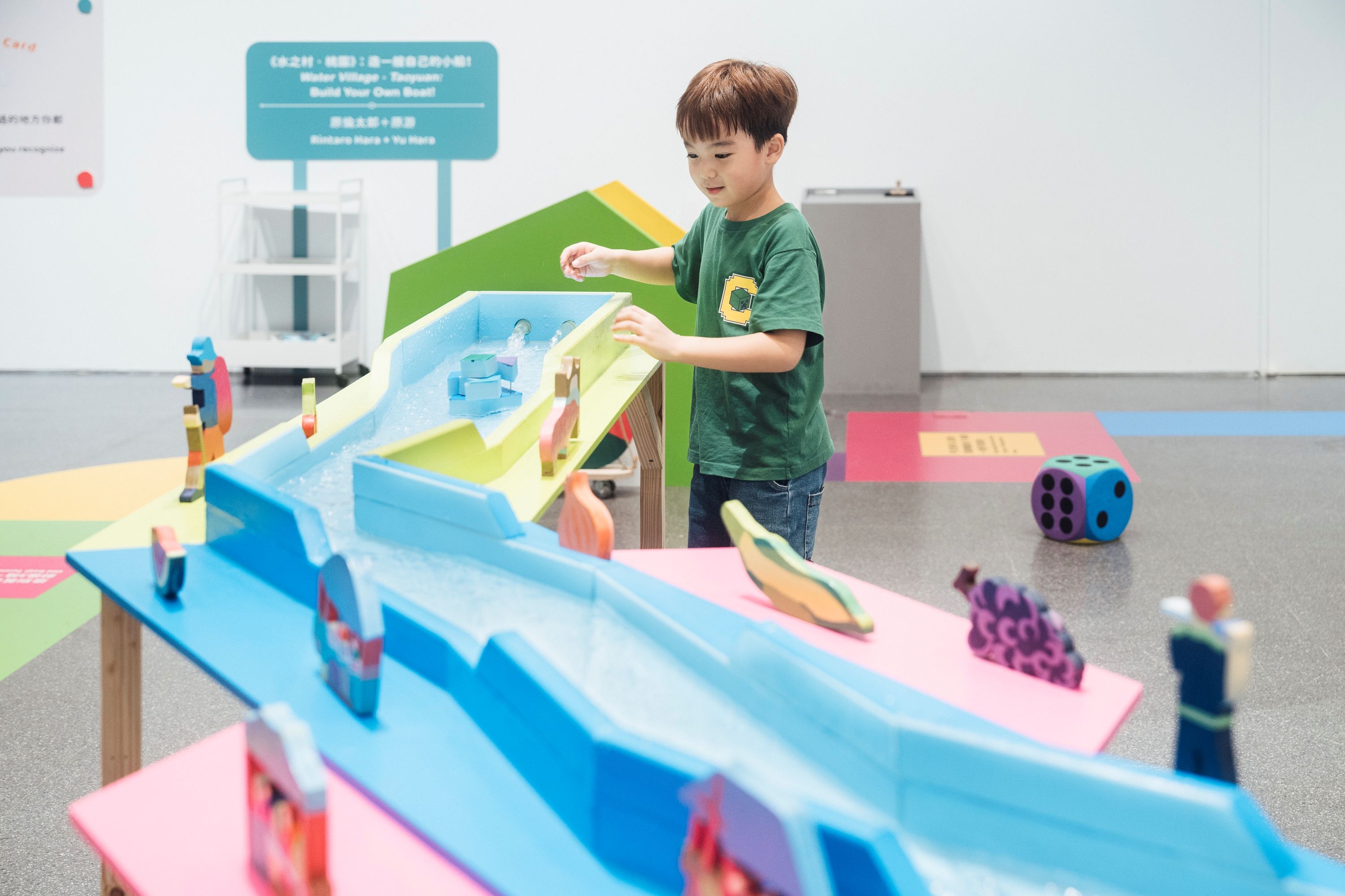 來自日本的藝術家原倫太郎與原游,呼應桃園水文化特色,在展廳打造近15公尺長的水道裝置〈水之村・桃園〉,孩子可以親手製作一艘獨一無二的小船,讓它沿著水面緩緩前行。途中經過桃園特色建築、自然景觀,也能看見身著泰雅族傳統服飾的在地族群身影,在潺潺水聲中,認識這座城市多元而豐富的故事。
