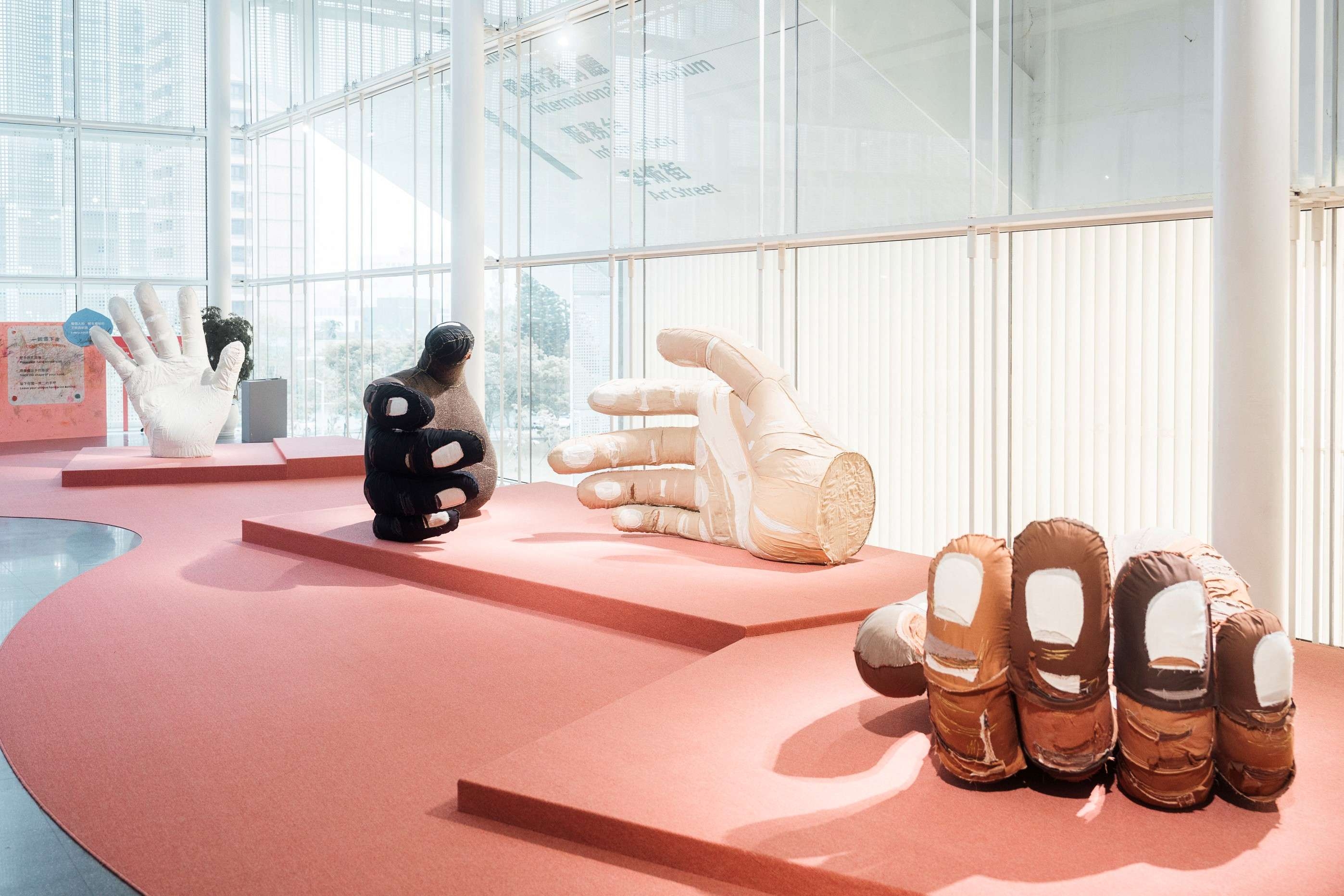 除了傾聽,我們也能透過身體傳遞感受。鹽池工作室〈手的旅行日記〉打造巨型手掌裝置,從打招呼的手勢,引導孩子透過肢體語言表達自己。「來自世界各地的人,在語言不通的情況下,手的動作往往是與人連接最直接的方式。」鹽池工作室吳有容從自身旅行經驗分享。她鼓勵大家試著靠近彼此,透過理解與感受,慢慢與他者建立關係。