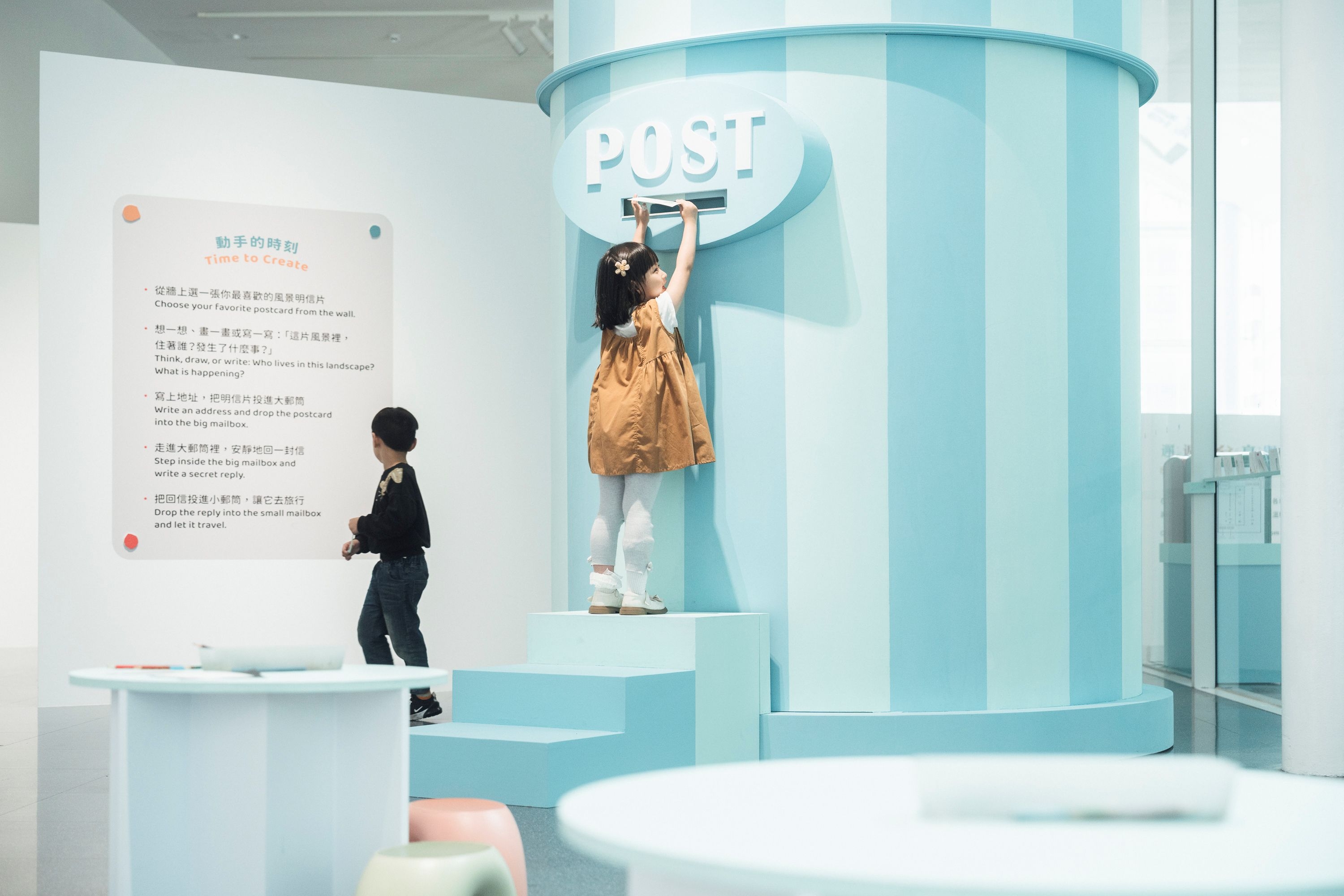 再走進尹子潔〈寄風景的人〉,孩子會發現,旅行不一定總是向前移動,也可以是一段安靜等待的時光。藝術家取齊柏林空拍「過去的桃園」風景,也是藝術家的故鄉,化成一張張可挑選、可書寫、可寄出的風景片段,邀請親子在拿起、寫下、投遞的過程中,感受時間的流動。那些被帶走的風景,也在展場留下空缺,輕聲提醒著人們:土地與風景並不是理所當然地存在,而值得被珍惜與記憶。孩子可以回應藝術家的提問,也可以回覆陌生人的明信片,最後寄出,悄悄把自己與土地、與他人串連在一起。