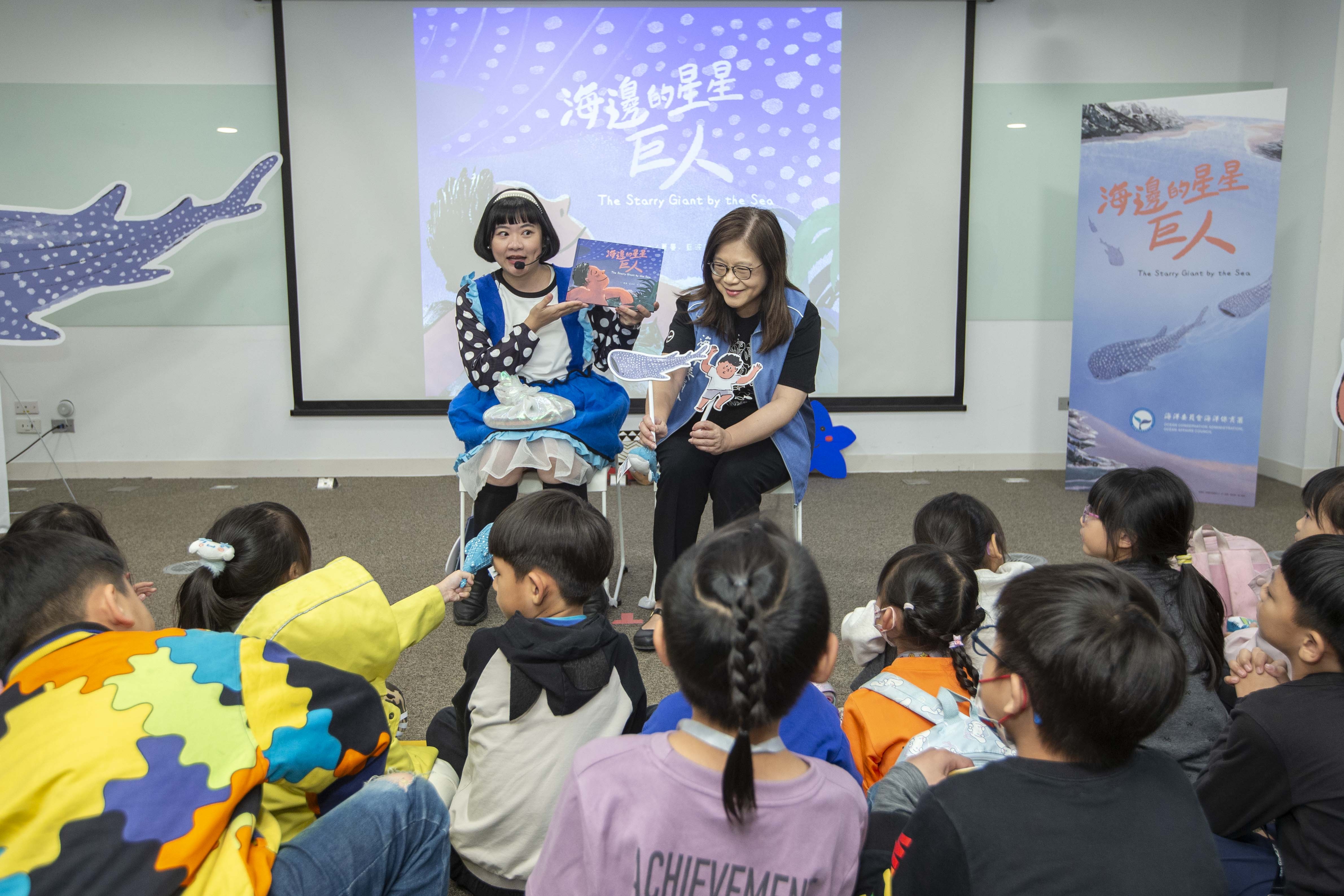 ▲海委會主委管碧玲及說故事姐姐與小朋友分享《海邊的星星巨人》繪本
