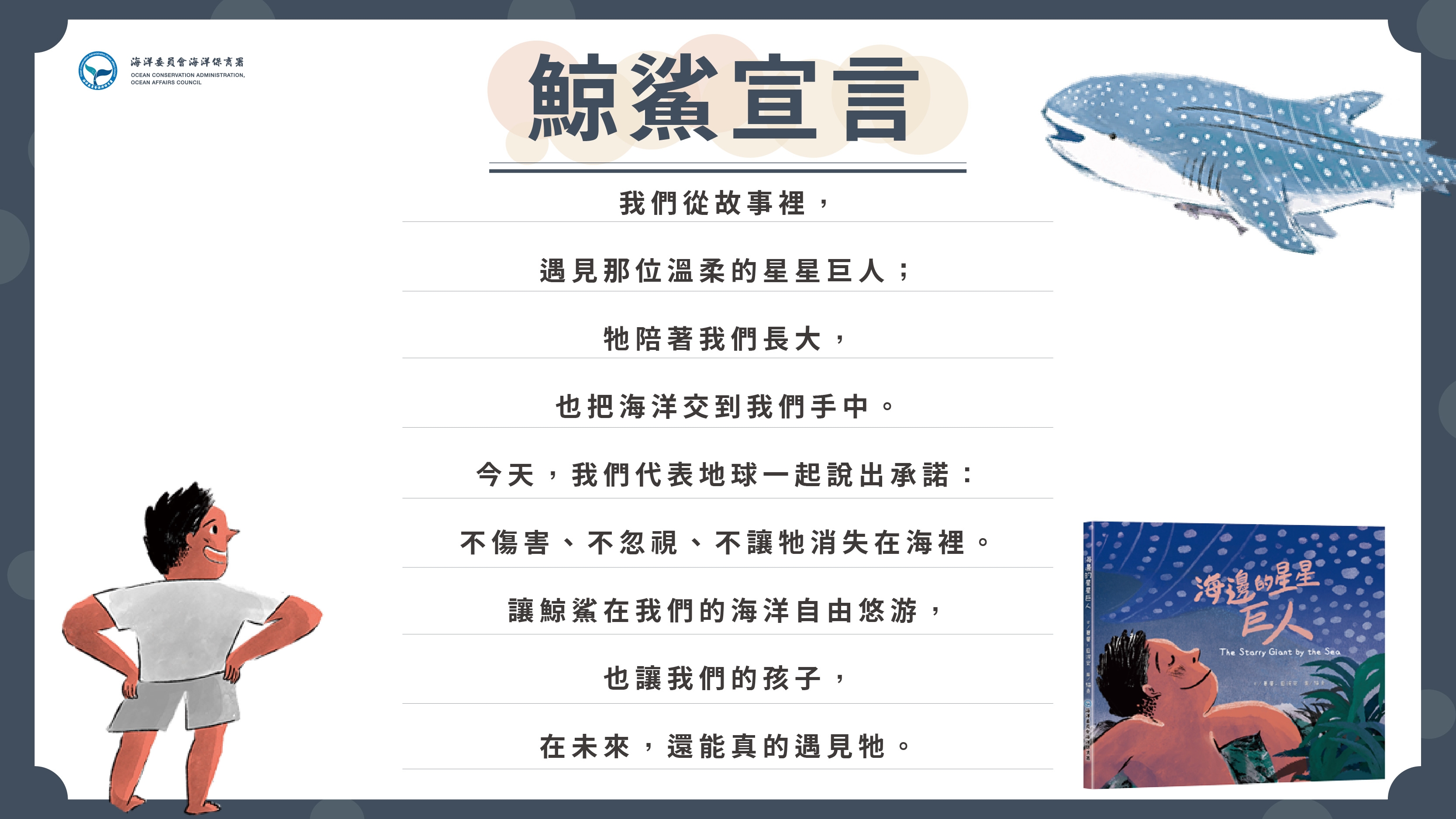 海洋保育署署長陸曉筠表示,《海邊的星星巨人》正是在這樣的信念下誕生。繪本由曾得海洋委員會海洋文化獎的海洋文學作家夏曼・藍波安與108年曾入圍波隆那插畫展,獲得第46屆金鼎獎的繪者貓魚共同創作,以孩子的眼睛觀看世界,描繪小男孩與鯨鯊在星空與海洋之間相遇、陪伴與成長的故事。透過細膩而溫柔的敘事,引領孩子認識這位「溫柔的海洋巨人」,希望孩子們跟繪本中的小男孩一樣,找到自己的守護神,一起面對困難和挑戰,也在潛移默化中,學習尊重生命、理解海洋、與自然好好相處。